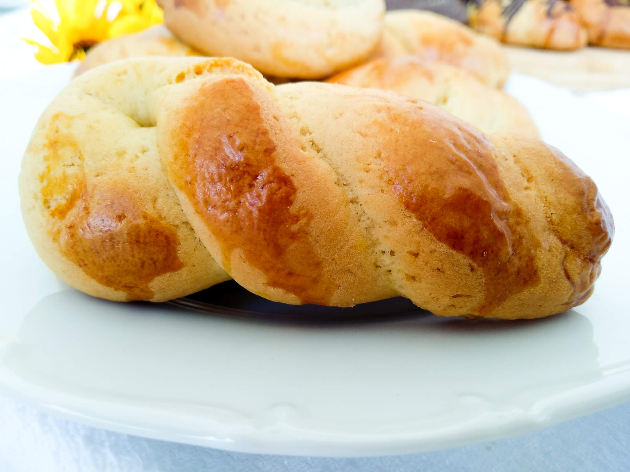 Προθερμαίνουμε τον φούρνο μας στους 170 βαθμούς στον αέρα. Στο μίξερ βάζουμε το σύρμα και χτυπάμε βούτυρο με ζάχαρη μέχρι να αφρατέψουν. Στη συνέχεια προσθέτουμε τους κρόκους και συνεχίζουμε το χτύπημα μέχρι να έχουμε ένα ομογενοποιημένο μείγμα. Σταματάμε το μίξερ, βγάζουμε το σύρμα και βάζουμε το φτερό. Προσθέτουμε όλα τα υπόλοιπα υλικά εκτός από το αλεύρι, το οποίο το προσθέτουμε σταδιακά. Δεν θα χρειαστεί όλο το αλεύρι για αυτό το ρίχνουμε σε στάδια μέχρι να σχηματιστεί μια λεία, μαλακή και ελαστική ζύμη που να μην κολλάει στα χέρια. Αν δούμε ότι κολλάει ρίχνουμε και το υπόλοιπο αλεύρι.