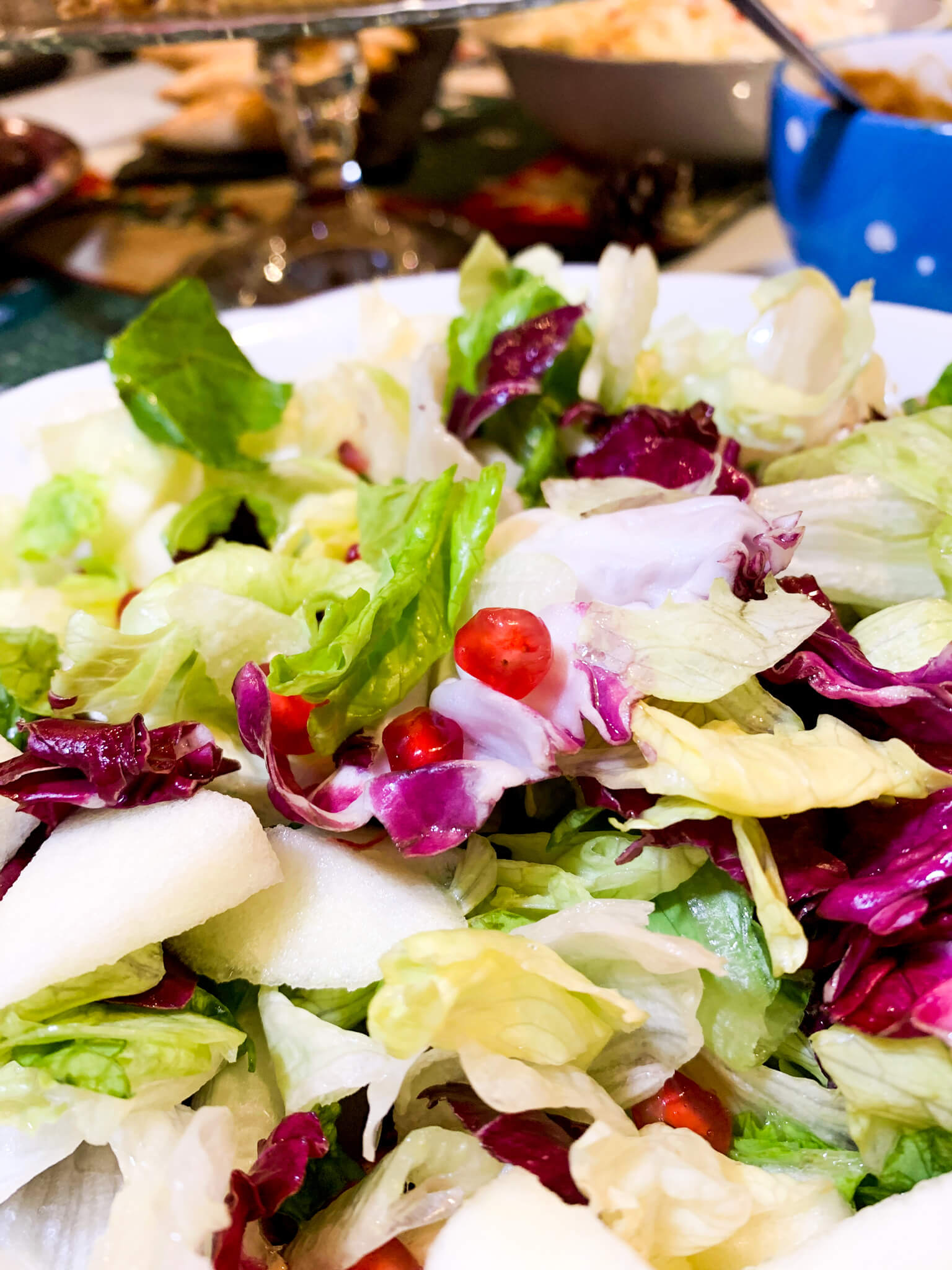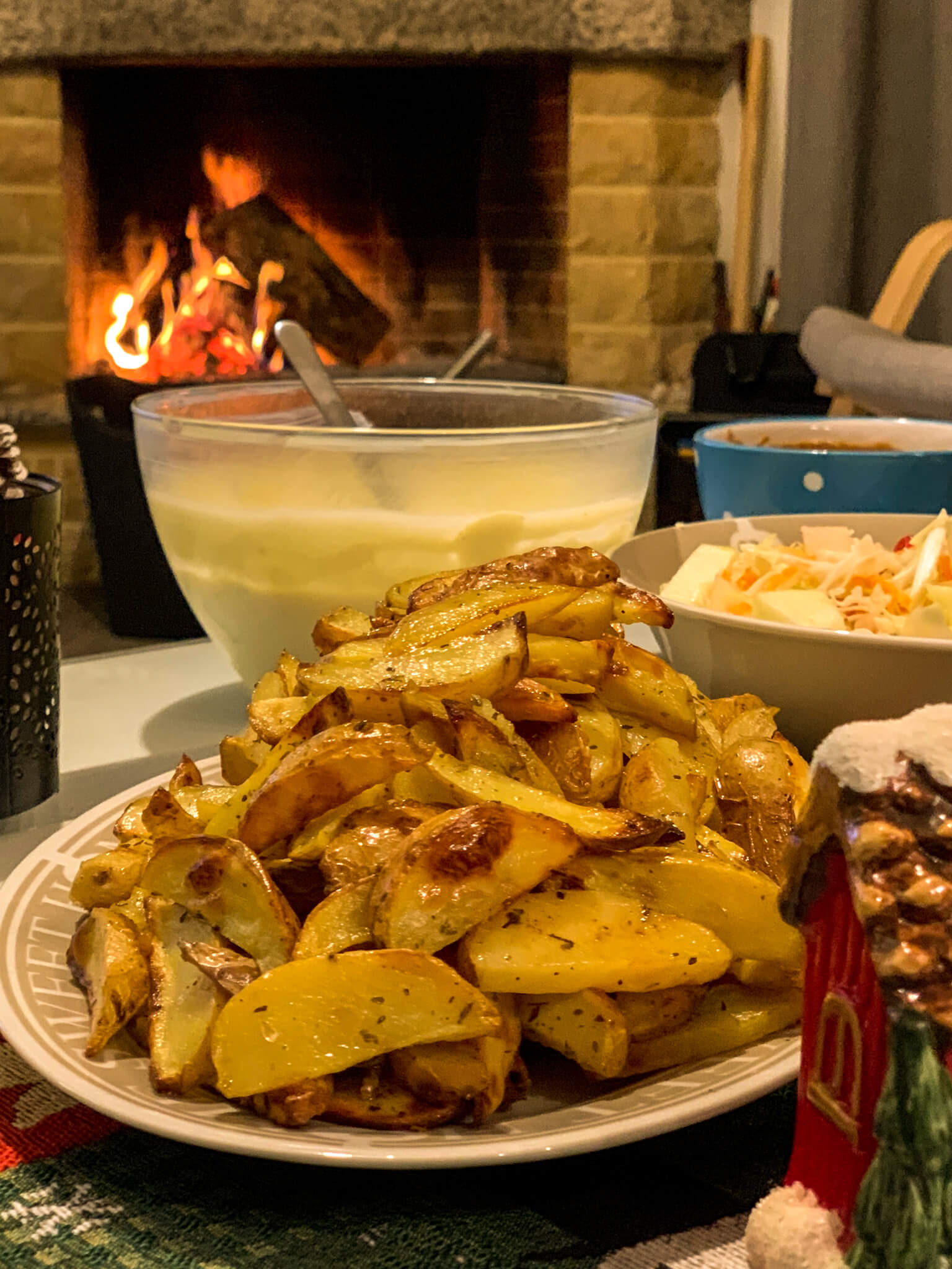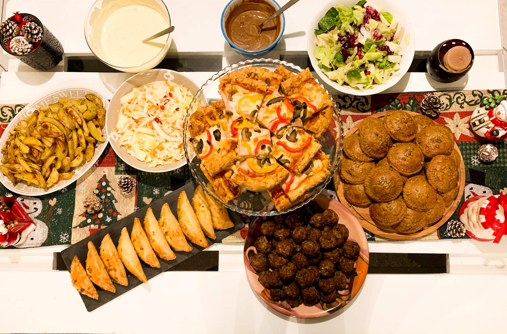 Το μενού λοιπόν περιείχε 2 σαλάτες με ξινόμηλο, ρόδι και μια δικιά μου σως. Πίτσα με σπιτική ζυμή. Πιτάκια κουρού με χειροποίητη ζύμη. Κεφτεδάκια στον φούρνο. Πατάτες σαν τηγανιτές και 1 σάλτσα γιαουρτιού. Στο μενού προστέθηκαν έξτρα μία τάρτα που μου έφεραν και μία κιμαδόπιτα. Για εφτά άτομα που ήμασταν εμείς μας έμεινε και φαγητό για την επόμενη μέρα.