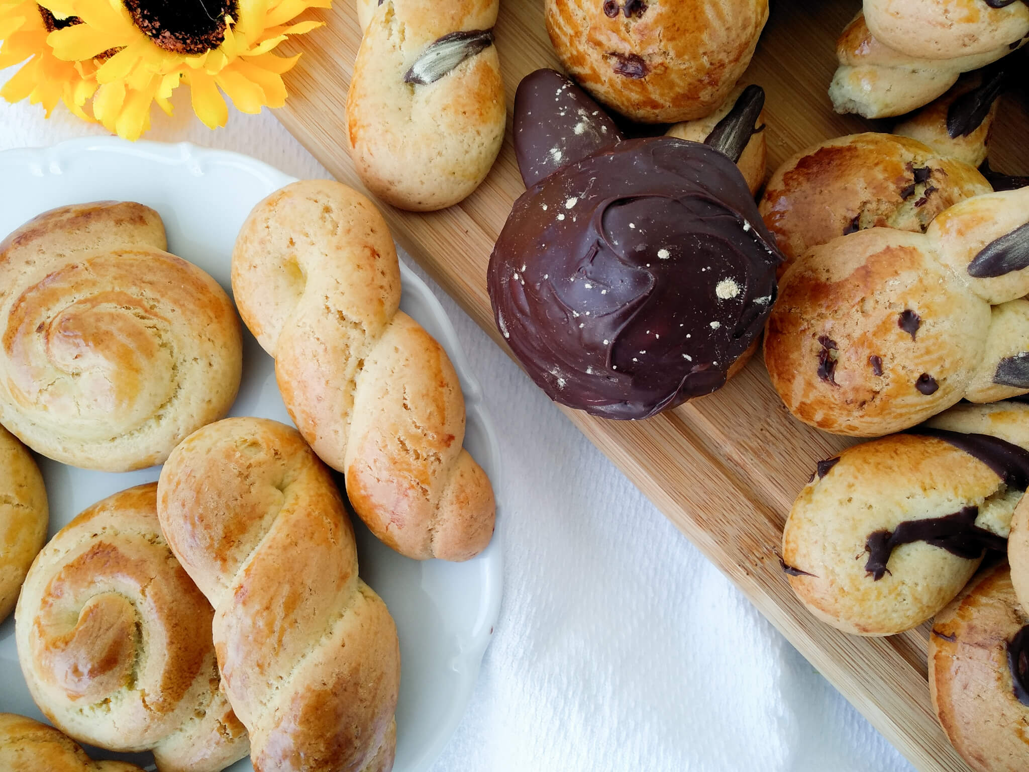 Προθερμαίνουμε τον φούρνο μας στους 170 βαθμούς στον αέρα. Στο μίξερ βάζουμε το σύρμα και χτυπάμε βούτυρο με ζάχαρη μέχρι να αφρατέψουν. Στη συνέχεια προσθέτουμε τους κρόκους και συνεχίζουμε το χτύπημα μέχρι να έχουμε ένα ομογενοποιημένο μείγμα. Σταματάμε το μίξερ, βγάζουμε το σύρμα και βάζουμε το φτερό. Προσθέτουμε όλα τα υπόλοιπα υλικά εκτός από το αλεύρι, το οποίο το προσθέτουμε σταδιακά. Δεν θα χρειαστεί όλο το αλεύρι για αυτό το ρίχνουμε σε στάδια μέχρι να σχηματιστεί μια λεία, μαλακή και ελαστική ζύμη που να μην κολλάει στα χέρια. Αν δούμε ότι κολλάει ρίχνουμε και το υπόλοιπο αλεύρι.