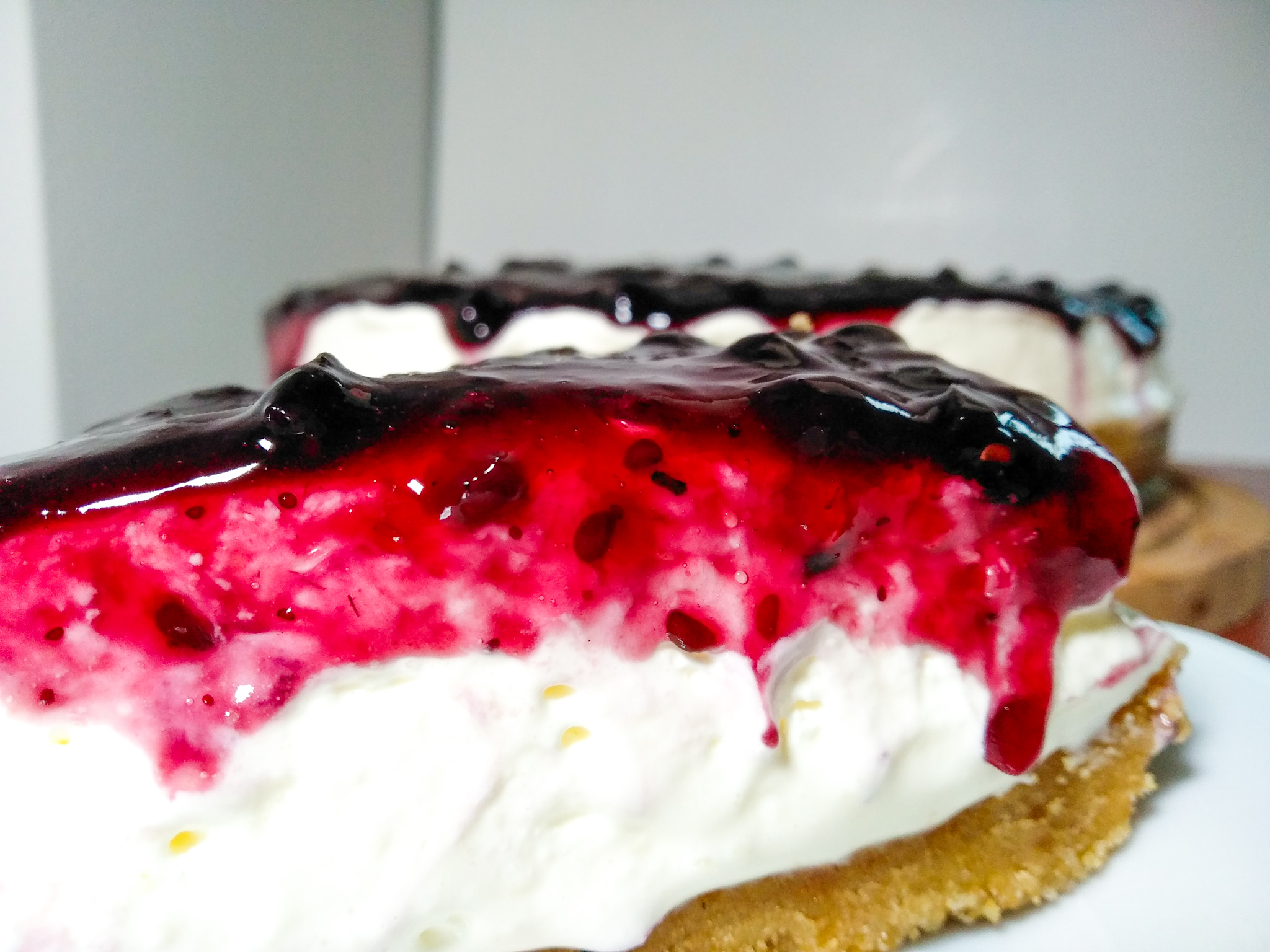 Σταματάμε το μίξερ και προσθέτουμε την χτυπημένη κρέμα γάλακτος και ανακατεύουμε μέχρι να ομογενοποιηθούν όλα μαζί. Εφόσον το μείγμα έχει ομογενοποιηθεί και σφίξει, σταματάμε το μίξερ και ρίχνουμε τη κρέμα μας πάνω από τη βάση μελομακάρονου. Βάζουμε στο ψυγείο να παγώσει καλά τουλάχιστον μία ώρα. Όταν είναι έτοιμο για σερβίρισμα τότε ρίχνουμε απο πάνω και την μαρμελάδα μας την οποία αραιώνουμε, ελαφρώς, με λίγο νεράκι.