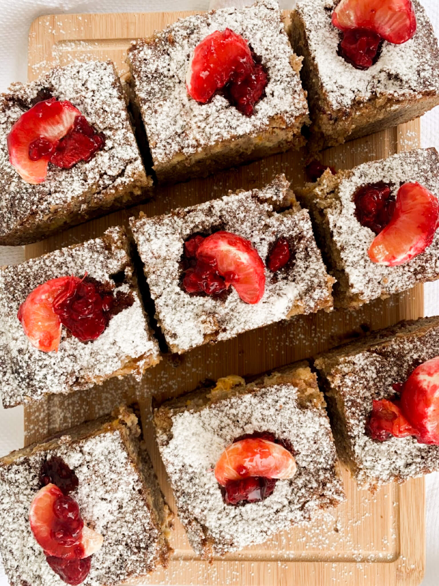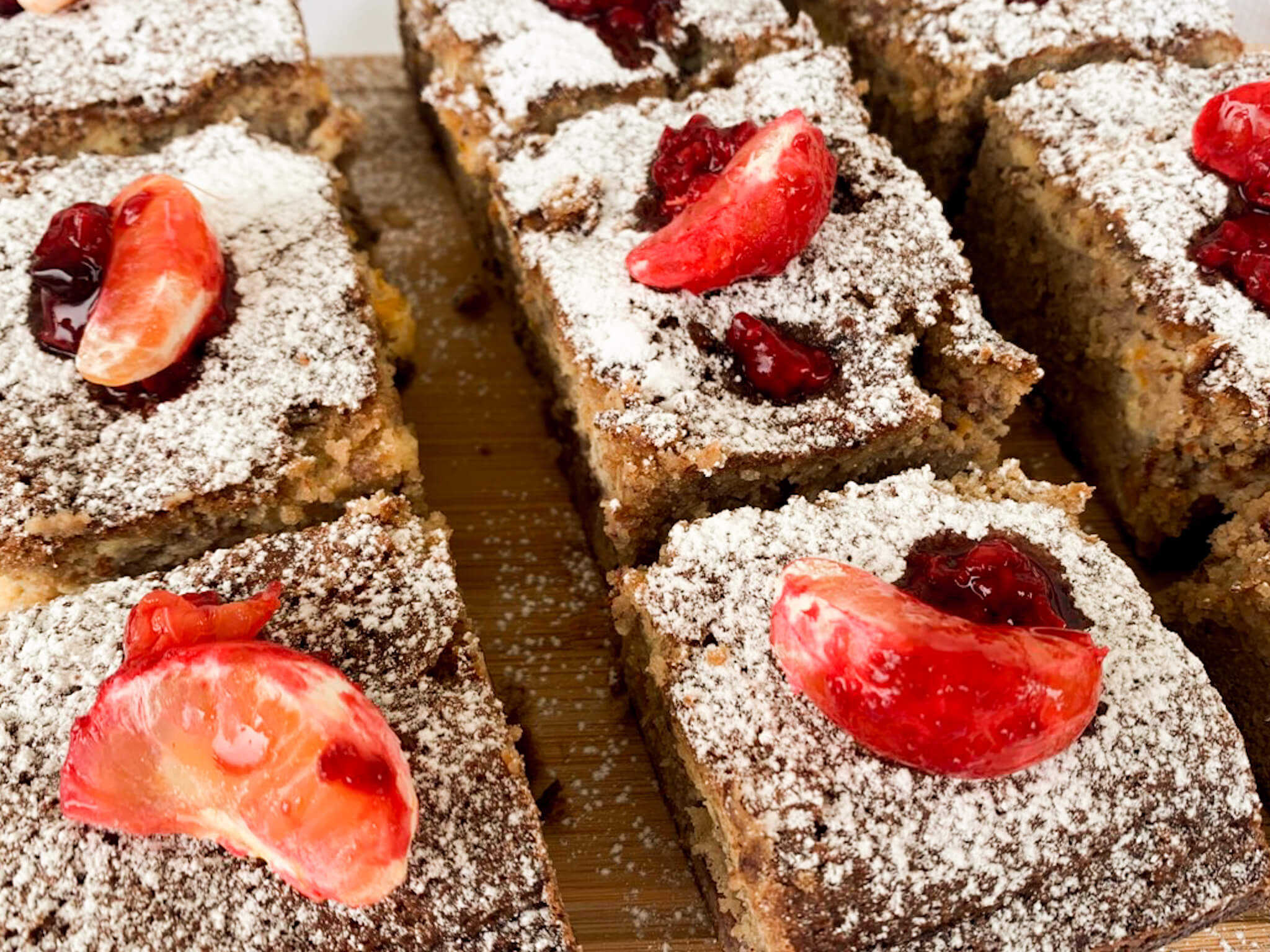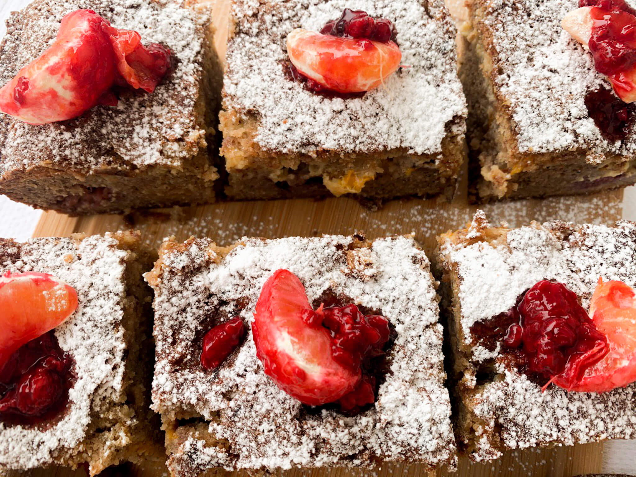 Ελέχουμε ότι ψήθηκε εσωτερικά με ένα μαχαιράκι στο κέντρο (να βγαίνει στεγνό) και αφήνουμε να κρυώσει πολύ καλά. Κόβουμε σε τετράγωνα κομμάτια και στολίζουμε με ζάχαρη άχνη και τα έξτρα φρουτάκια. EXTRA TIP: Απολαμβάνουμε με μια κούπα ζεστό, δυνατό καφέ. Καλή απόλαυση! 🙂