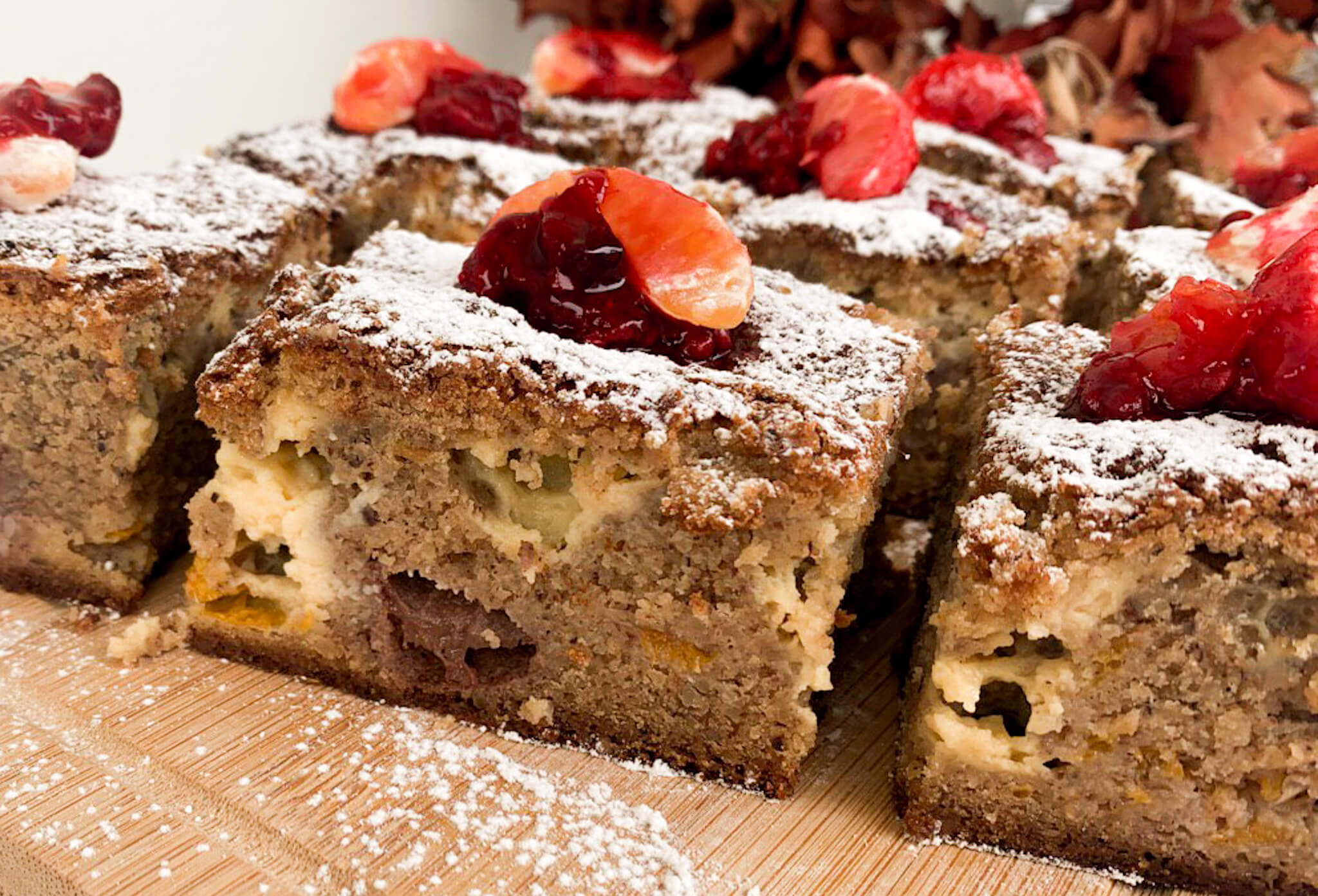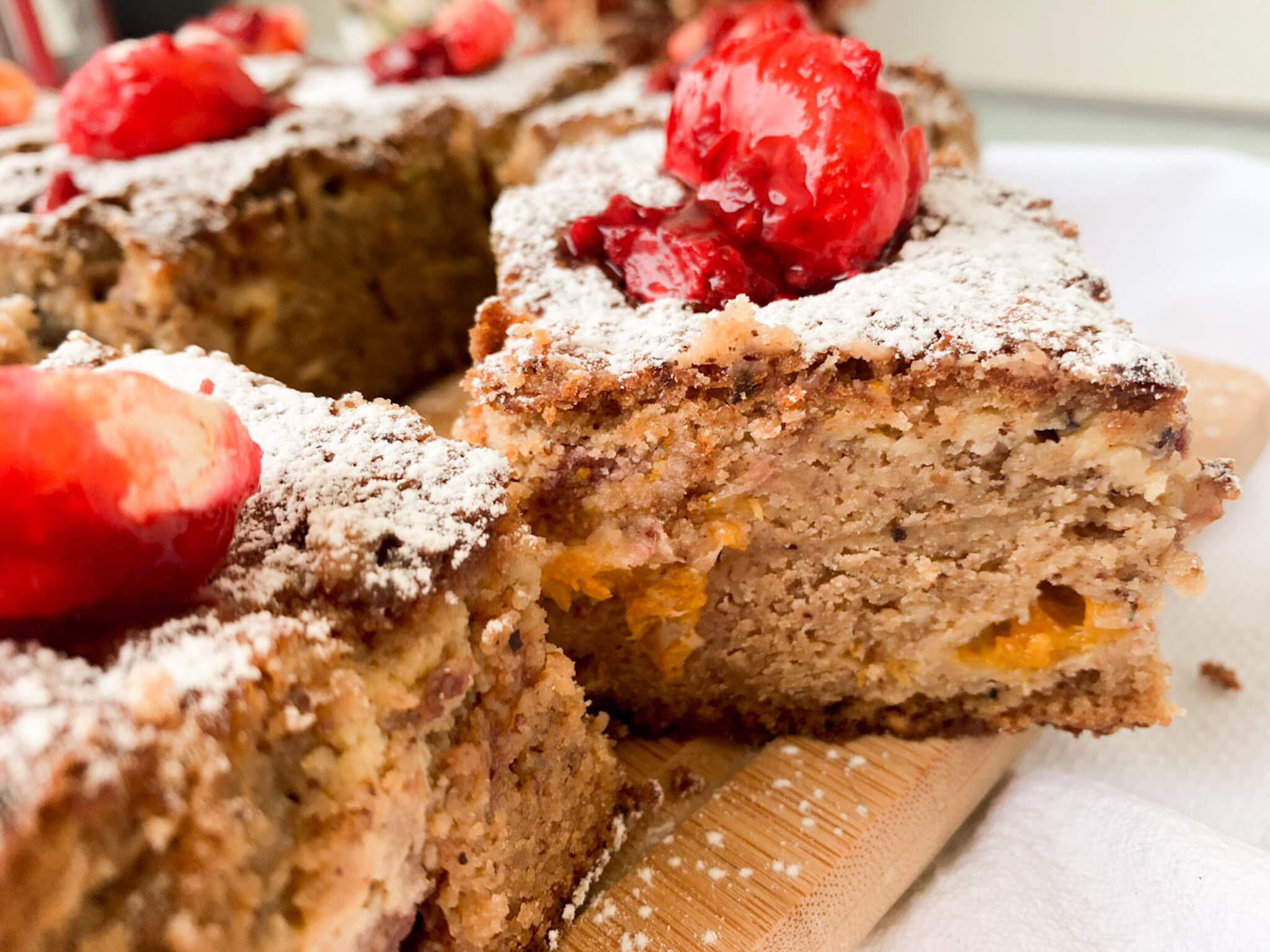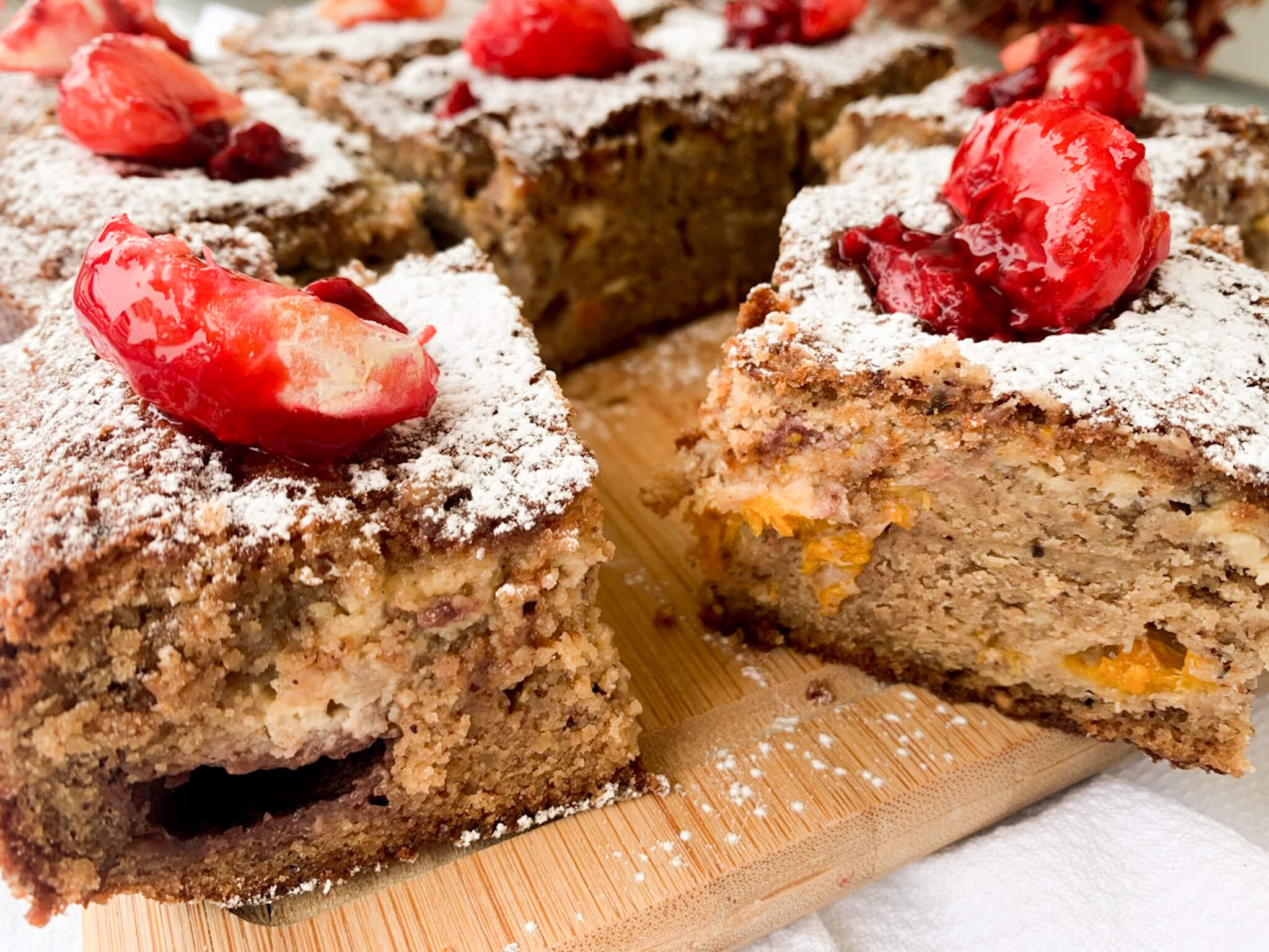 Ελέχουμε ότι ψήθηκε εσωτερικά με ένα μαχαιράκι στο κέντρο (να βγαίνει στεγνό) και αφήνουμε να κρυώσει πολύ καλά. Κόβουμε σε τετράγωνα κομμάτια και στολίζουμε με ζάχαρη άχνη και τα έξτρα φρουτάκια. EXTRA TIP: Απολαμβάνουμε με μια κούπα ζεστό, δυνατό καφέ. Καλή απόλαυση! 🙂