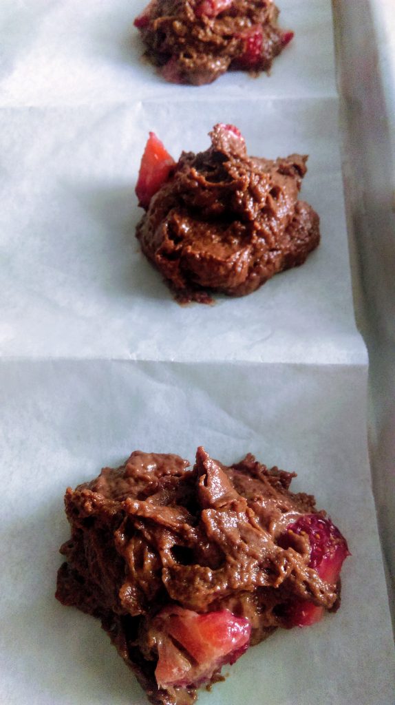 Στρώνουμε αντικολλητικό χαρτί σε λαμαρίνα και με τη βοήθεια 2 μικρών κουταλιών μοιράζουμε στη λαμαρίνα μας. Καλό είναι να κρατάμε απόσταση ανάμμεσα στα μπισκότα για να μην κολλήσουν μεταξύ τους στο ψήσιμο. Ψήνουμε για 7΄… τόσο απλά!