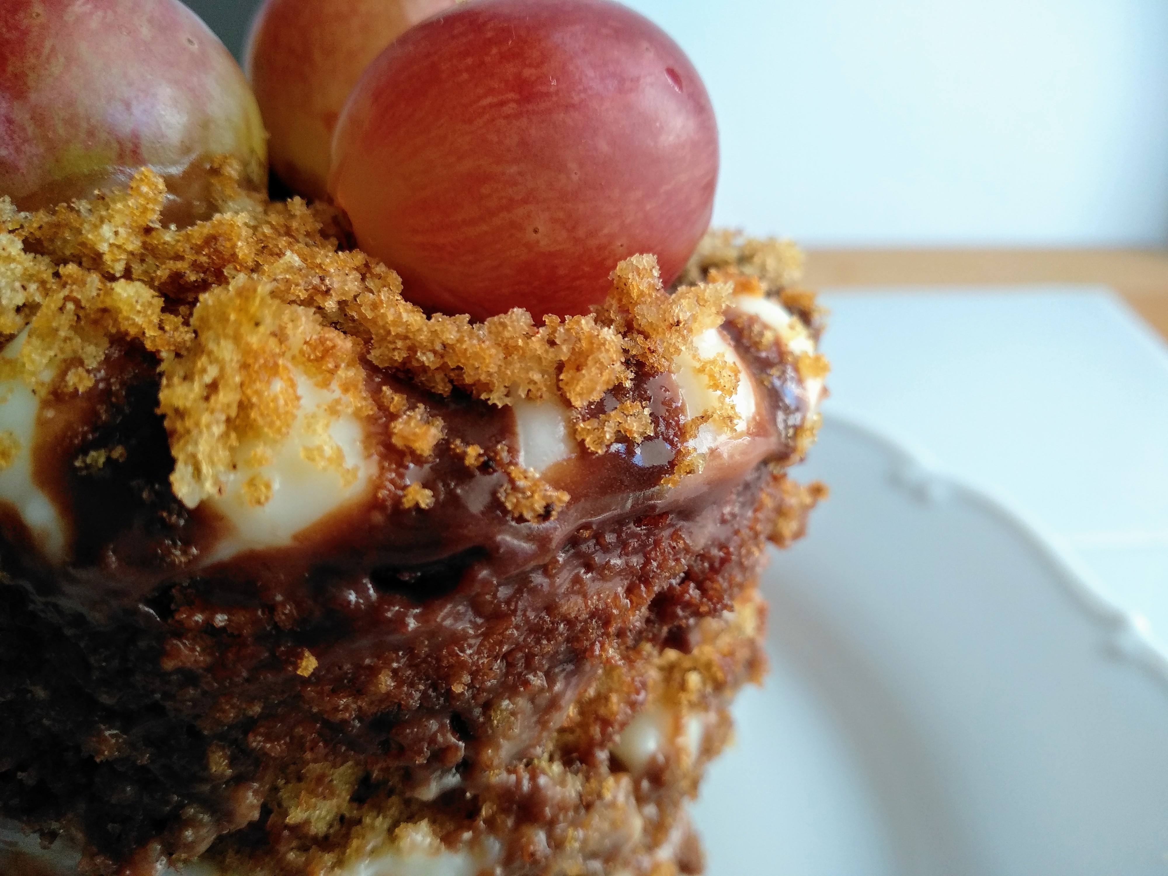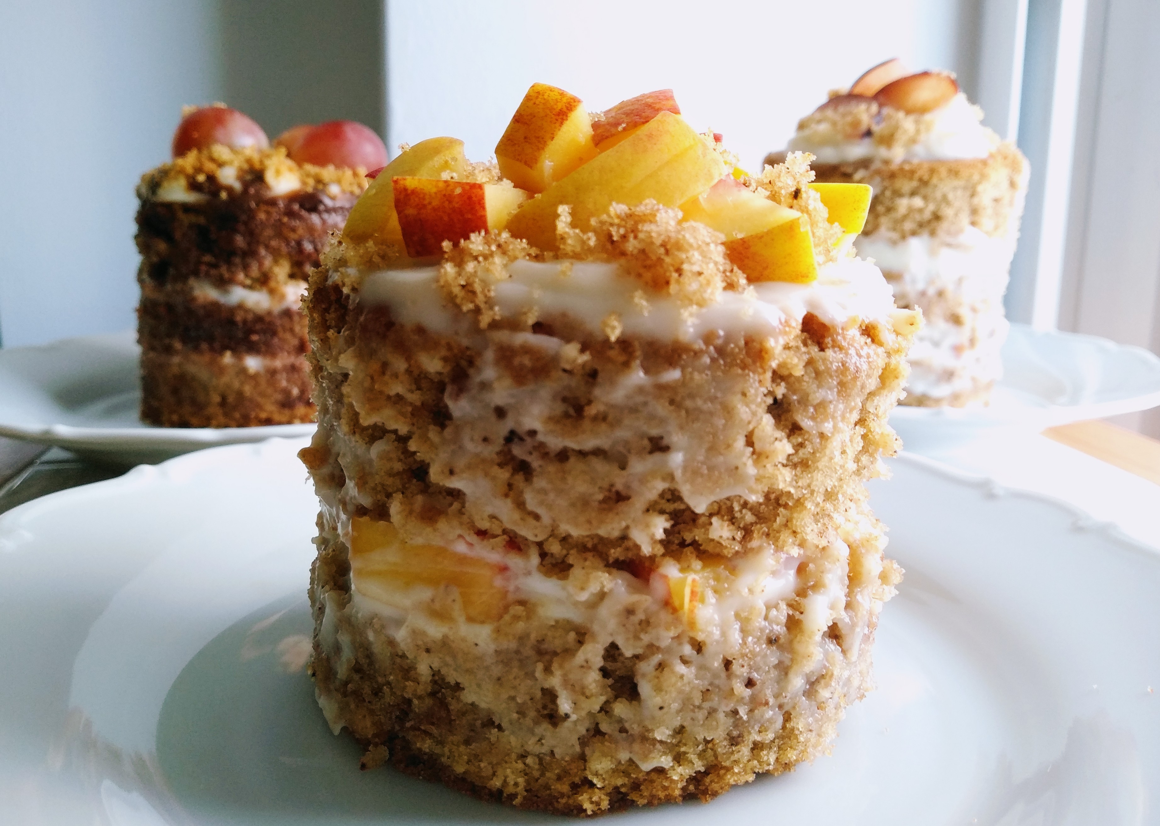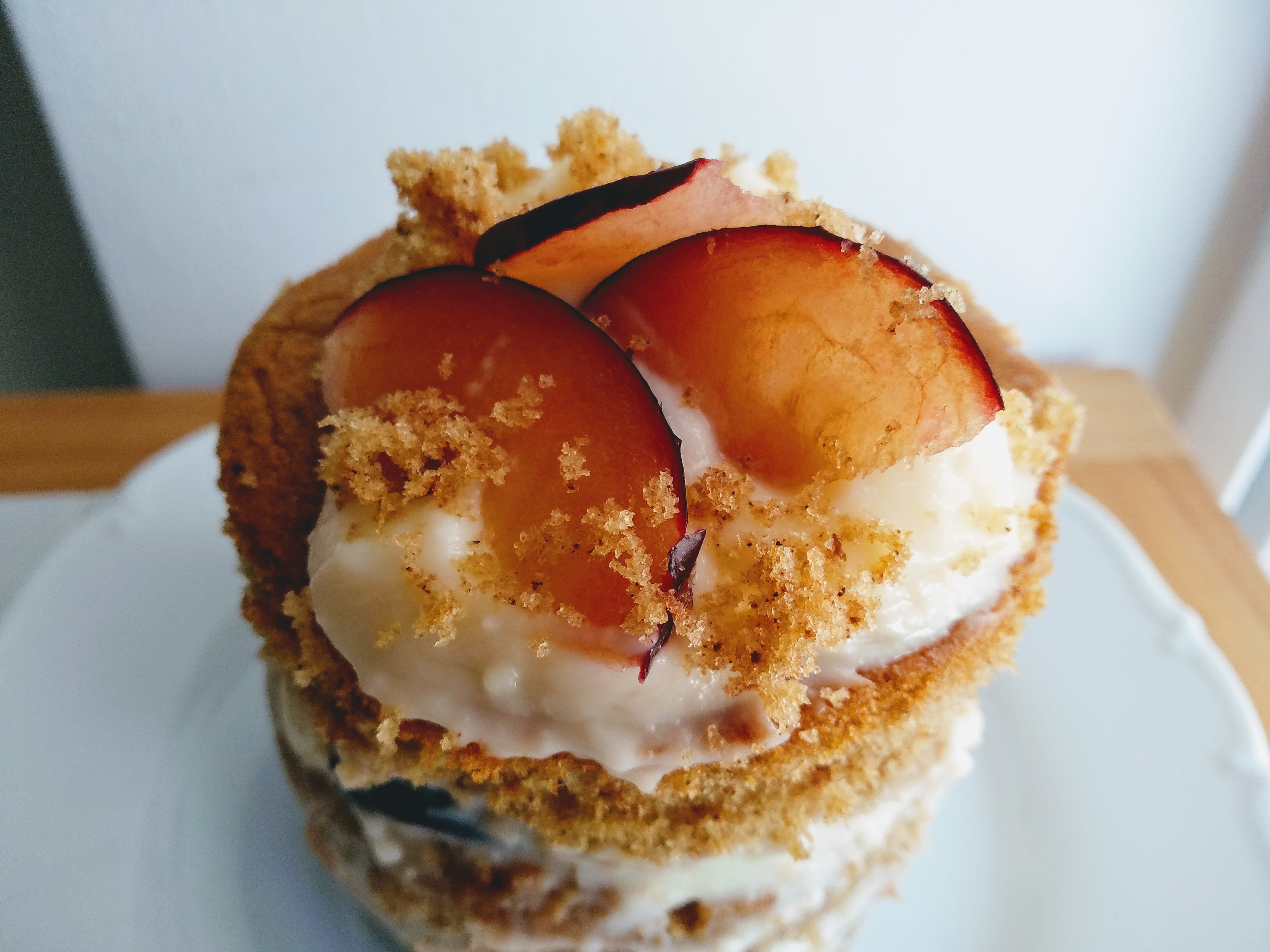 Τώρα για τη συναρμολόγηση, ή που κόβεις σε 2 μέρη το κέικ σου και το γεμίζεις μέσα με τη κρέμα,τη σάλτσα και τα φρουτάκια της επιλογής σου ή που παίρνεις ένα μικρότερο τσέρκι και κόβεις σε ατομικές μερίδες το κείκ σου και κάνεις με μία συνταγή όσες παραλλάγες θέλεις όπως έκανα εγώ (χρησιμοποίησα δαμάσκηνο στο ένα, νεκταρίνι στο άλλο και σταφύλι σε αυτό με τη σάλτσα σοκολάτας, για ντεκόρ). Πιο διασκεδαστική η δεύτερη επιλόγη και πιο παιχνιδιάρικη σίγουρα!