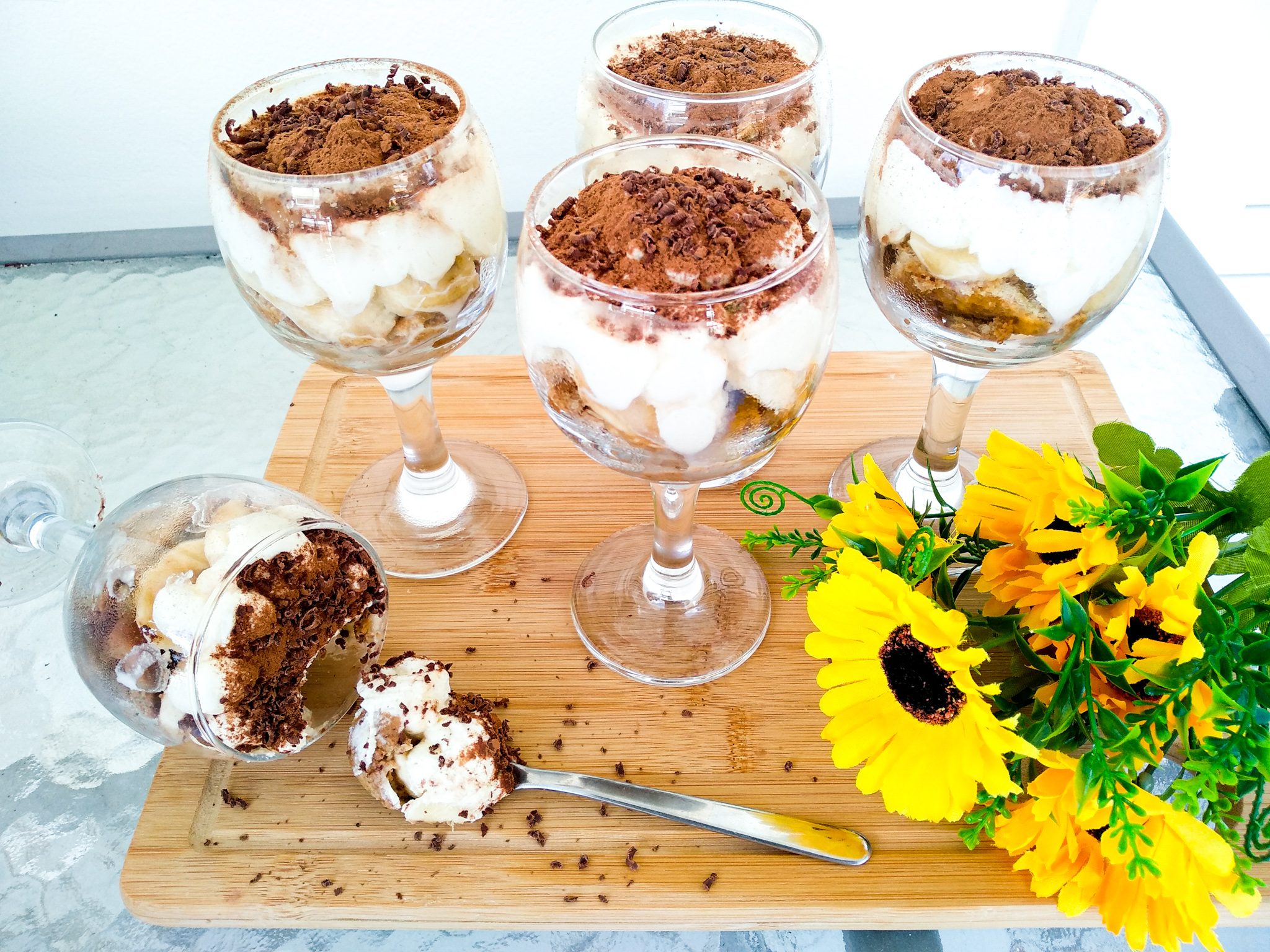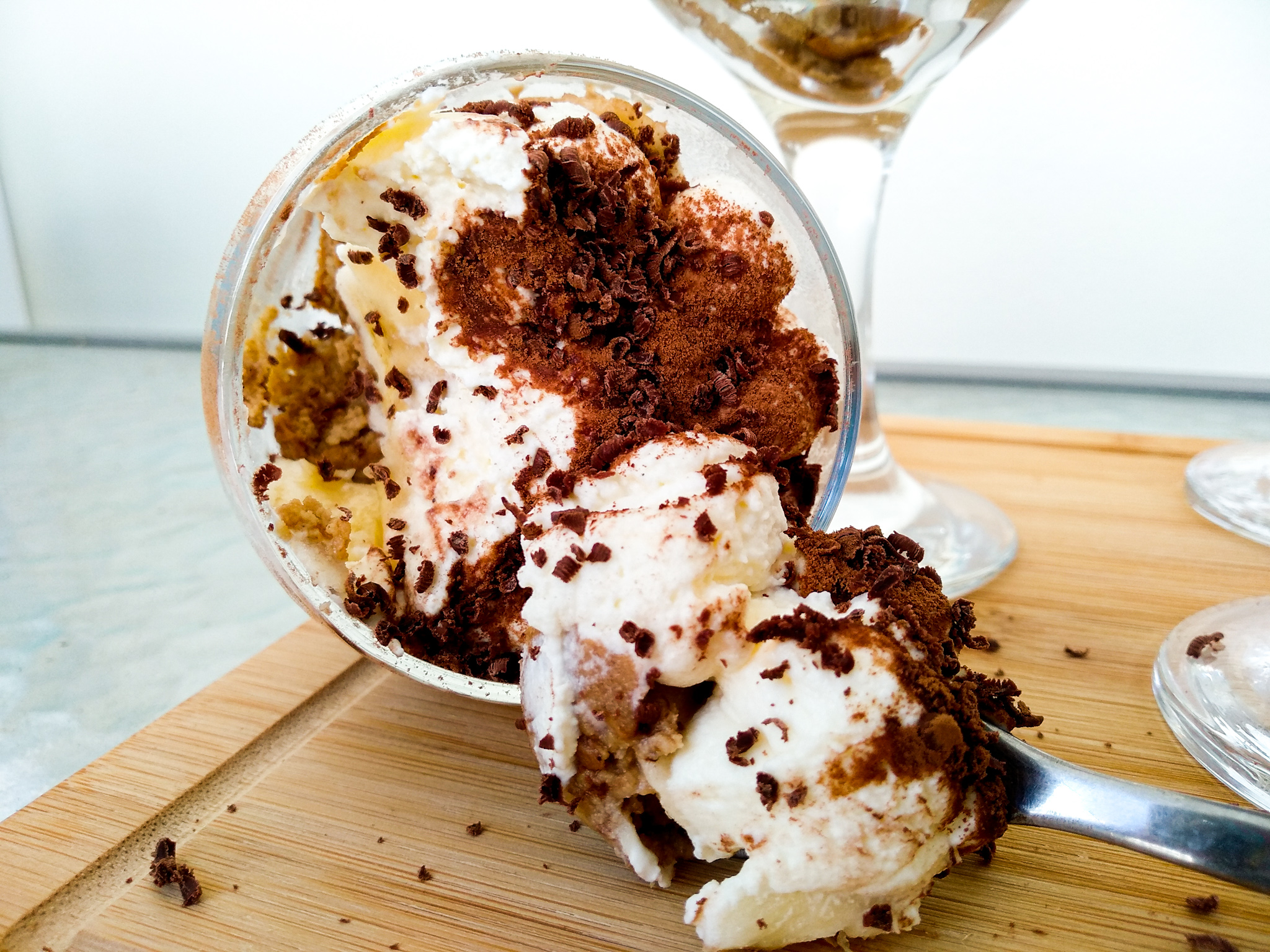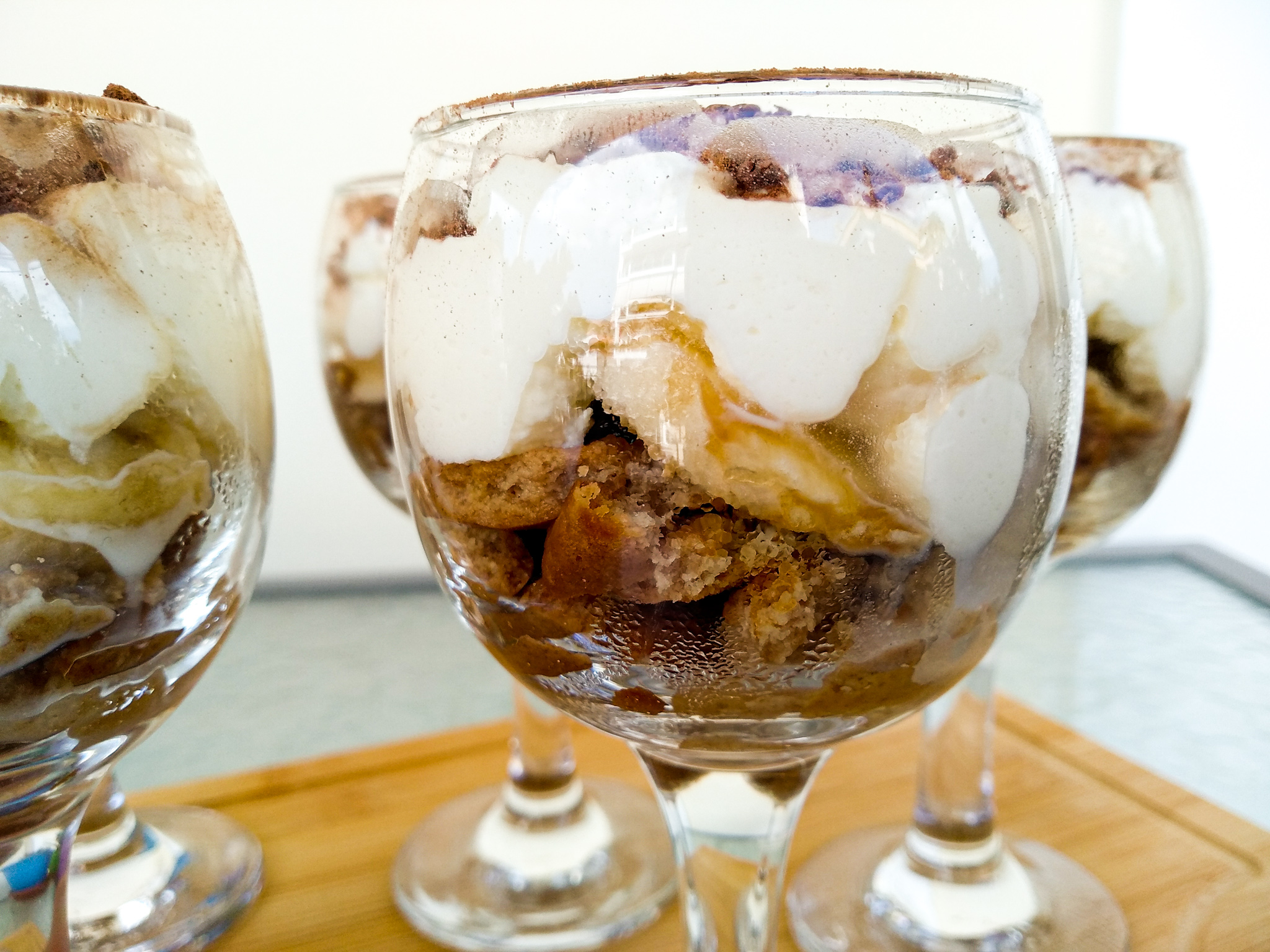 Η αλλαγή που έκανα λοιπόν στο tiramisu πέρα από την απουσία των αυγών, είναι η προσθήκη μπανανάς που δίνει μια έξτρα γεύση στη συνταγή και ταιριάζει απόλυτα με το espresso. Η επόμενη αλλαγή που έκανα είναι η αντικατάσταση των σαβαγιάρ με τα μπισκότα digestive. Αντί να χρησιμοποιήσω τα σαβαγιάρ προτίμησα τα κλασικά digestive τα οποία προηγουμένως, εννοείται, ότι είχαν βουτηχτεί σε espresso. Όπως κατάλαβες αυτό το tiramisu κρύβει ευχάριστες εκπλήξεις! Ετοιμάσου να τις δοκιμάσεις, δεν θα σου πάρει πάνω από 20 λεπτά!